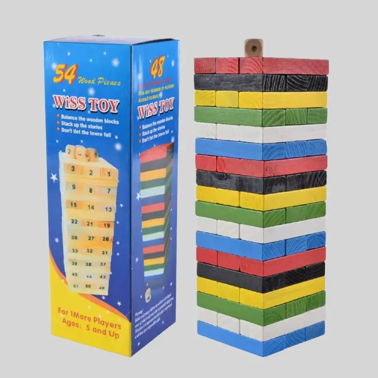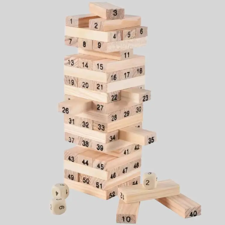 54pcs 48pcs Colorful Wooden Tumbling Tower Game Set Number Print Tumble Tower with Dice Penalty Cards for Tabletop Fun