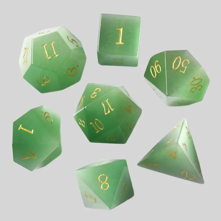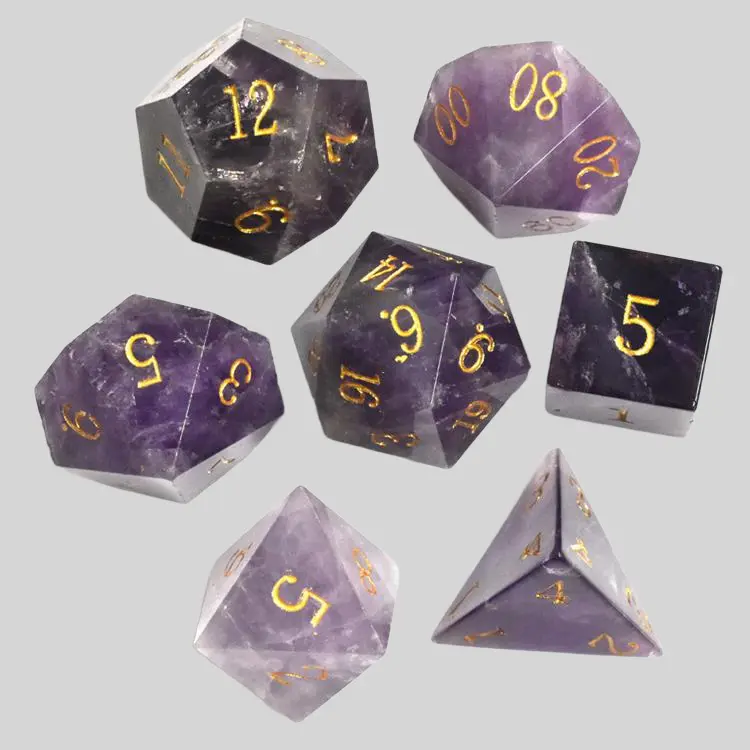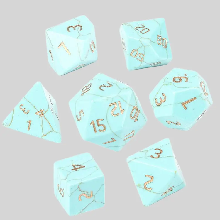 Custom Natural Gemstone Dice Set - Perfect for D&D, MTG, and RPG table games! These 3D gemstone dice, ranging from 7mm to 14mm, offer a beautiful and unique rolling experience. Crafted from natural stones and available in a mixed, colorful design, each set is die-cast and individually packaged.